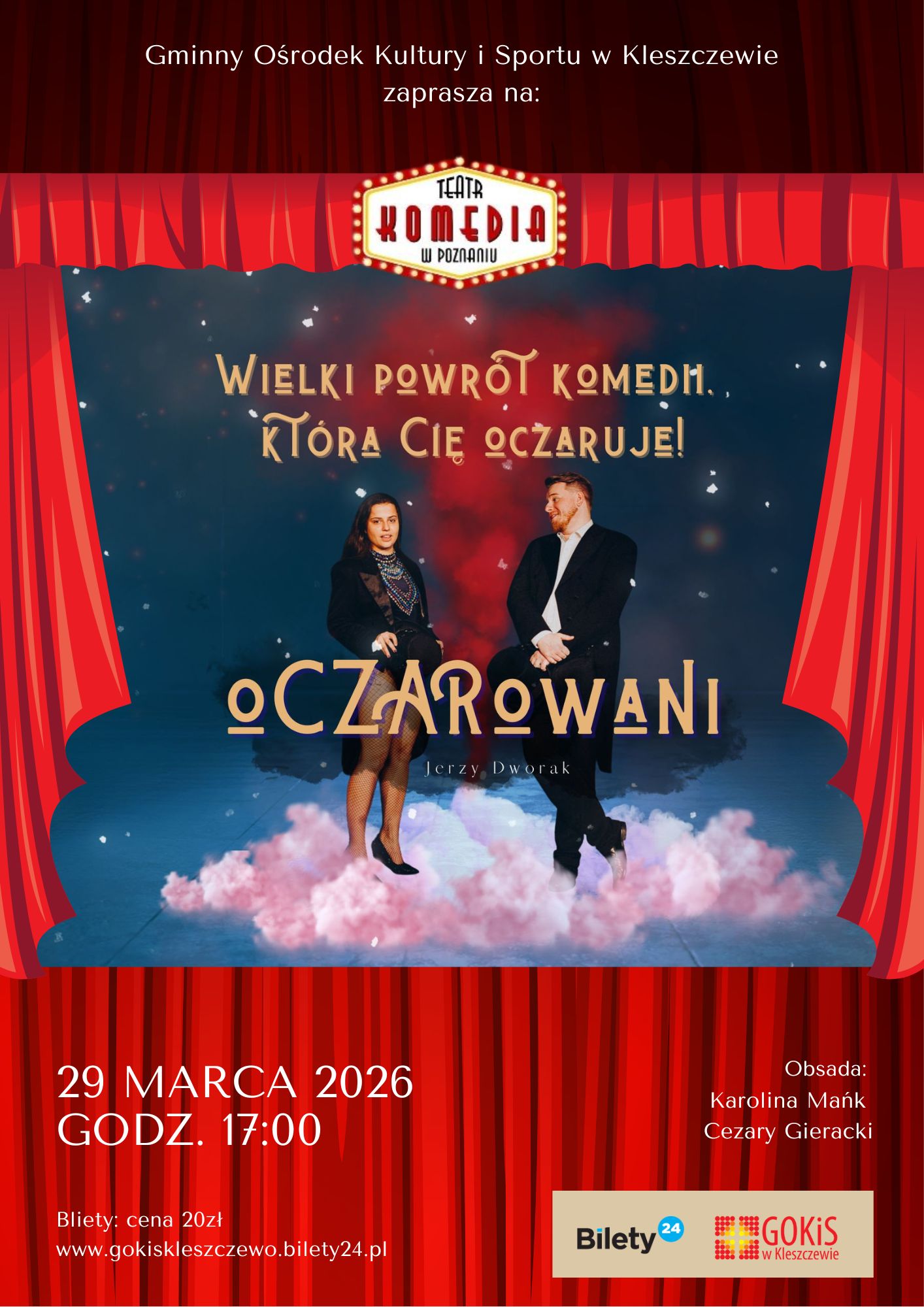 Serdecznie zapraszamy na wyjątkowy spektakl teatralny, który odbędzie się 29 marca o godzinie 17:00 w Gminnym Ośrodku Kultury i Sportu w Kleszczewie przy ul. Poznańskiej 6.